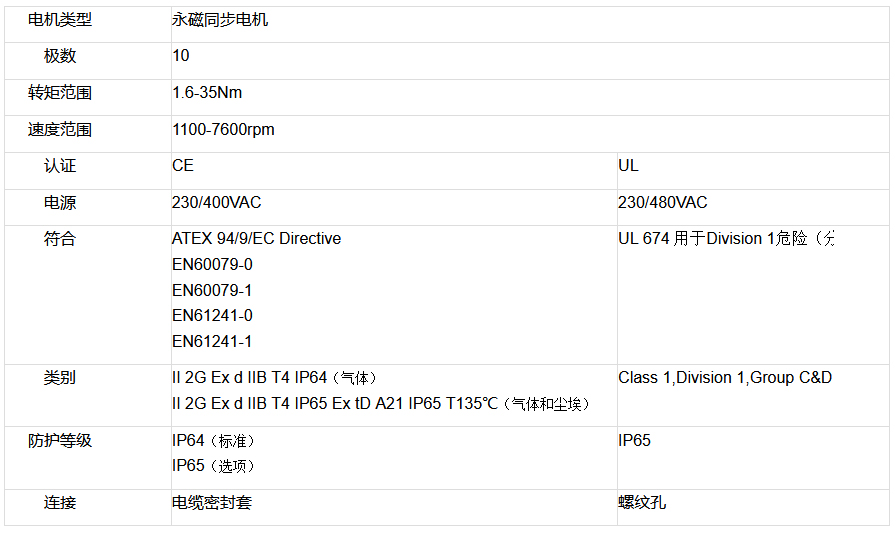 EX系列是設(shè)計(jì)適用于易燃?xì)怏w環(huán)境的一系列永磁同步伺服電機(jī),可用于II 2GD Ex d IIB T4 IP65 Ex tD A21 IP65 T135°C(氣體和塵埃)的工況。